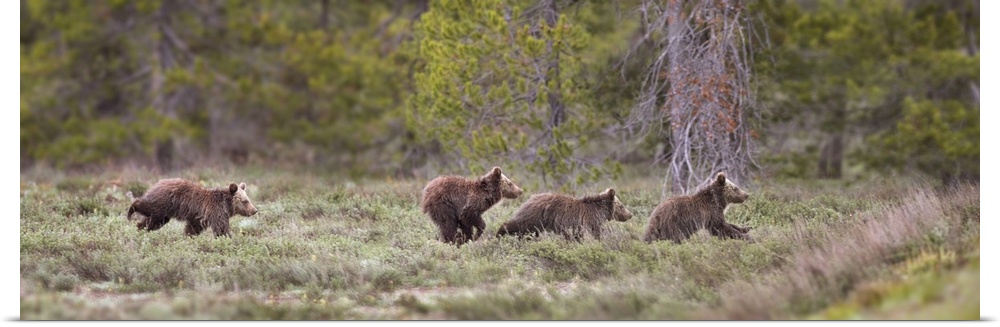 <p>USA, Wyoming, Grand Teton National Park. Yearling grizzly bears running to catch up with sow bear. Credit: Don Grall</p>