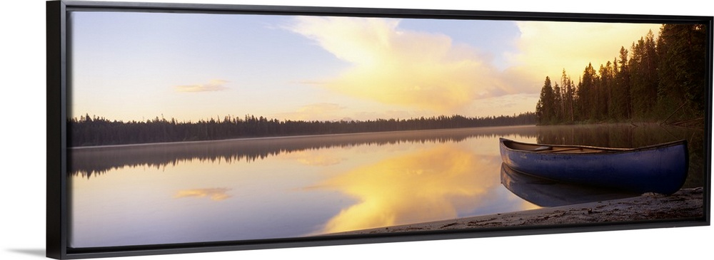 <p>Oversized landscape photograph of a partly cloudy sky and distant tree line, reflecting over the waters of Leigh Lake, a blue canoe sits along the shore, in Grand Teton Park, Wyoming.</p>