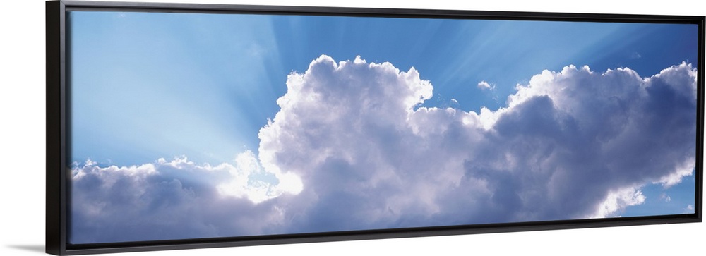 <p>This is a panoramic photograph looking up into a cluster of cumulus clouds and the sunlight radiating out from behind them.</p>