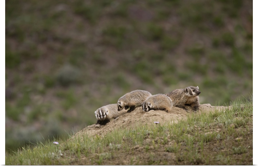 <p>USA, Wyoming, Yellowstone National Park. Badger kits and mother outside den. Credit: Don Grall</p>
