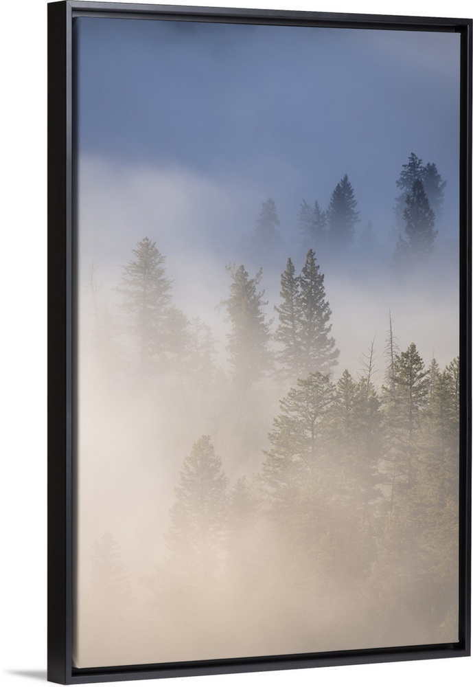 <p>USA, Wyoming, Yellowstone National Park. Cold morning creates a fog above the Yellowstone River, infiltrating the trees near Tower Falls at sunrise in Yellowstone National Park, Wyoming. Credit: Don Grall</p>