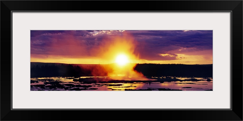 <p>Wide angle shot of the sun setting over Yellowstone as steam billows off the water below.</p>