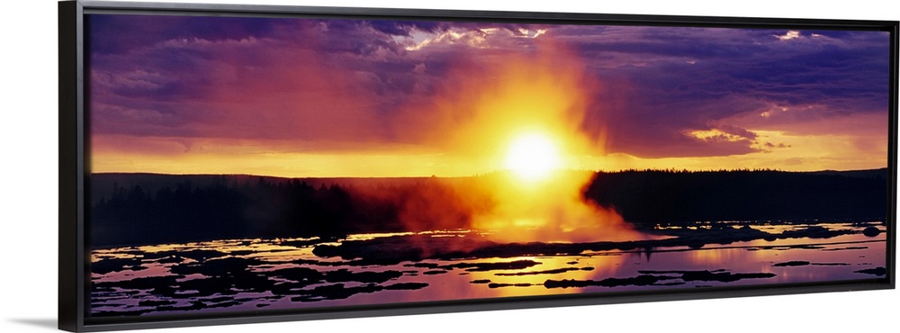 <p>Wide angle shot of the sun setting over Yellowstone as steam billows off the water below.</p>