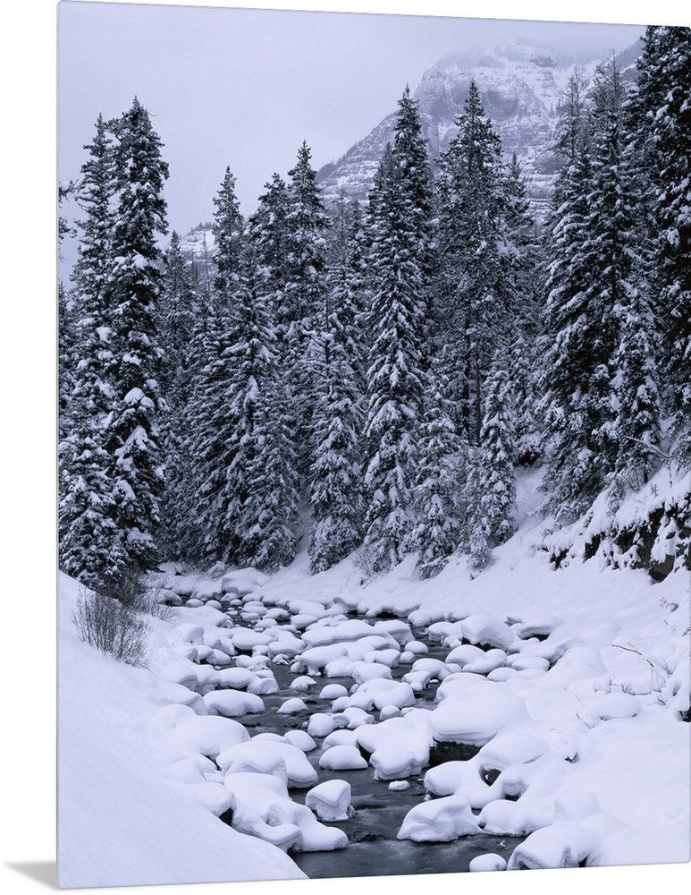 <p>Big, vertical photograph of a small stream of water running through a snow covered landscape, surrounded by tall pines, a large mountain in the background.</p>