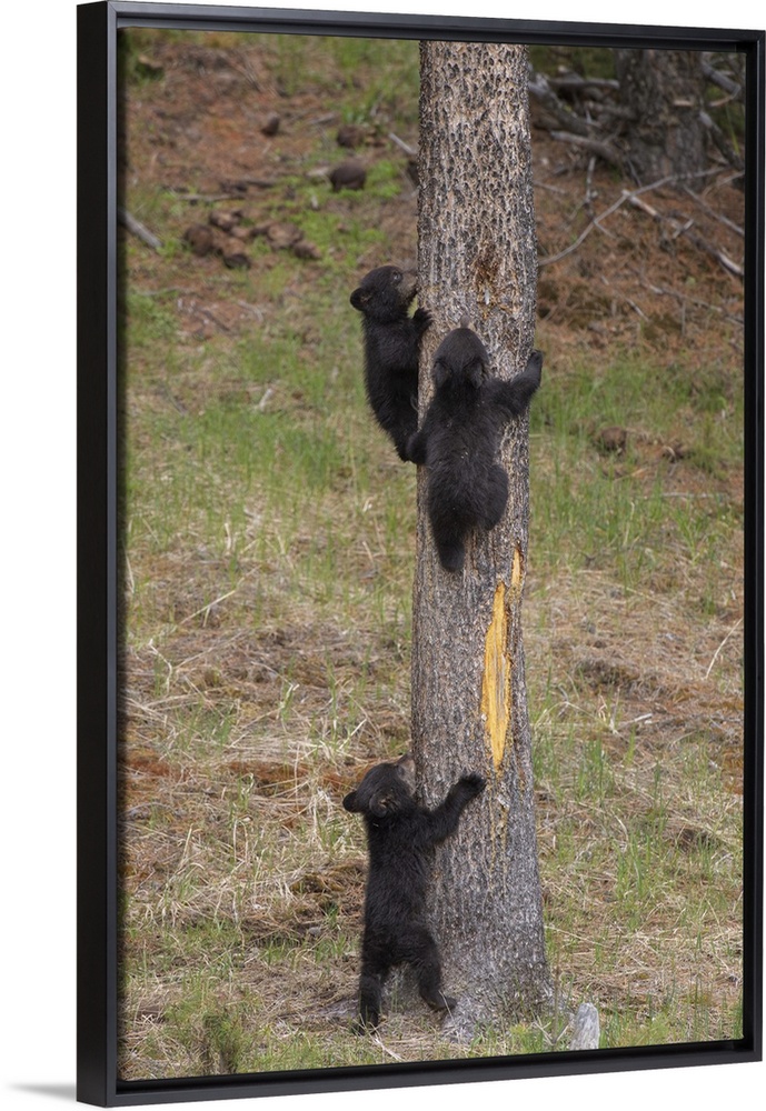 <p>USA, Wyoming, Yellowstone National Park. Three black bear cubs climb pine tree. Credit: Don Grall</p>