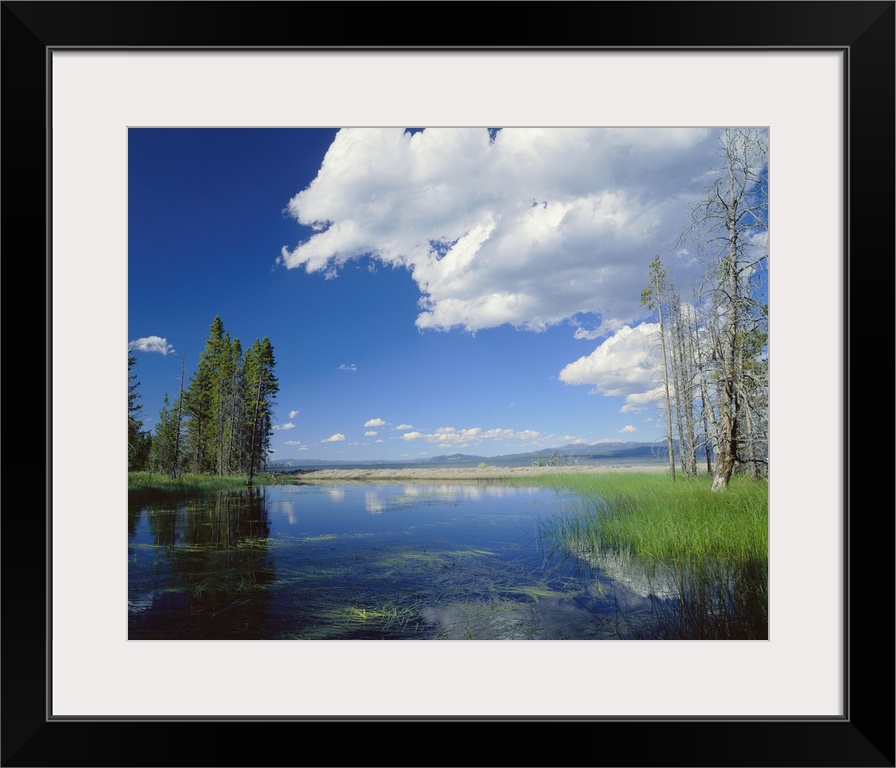<p>Large photo on canvas of a lake with clouds and a forest reflected in it.</p>