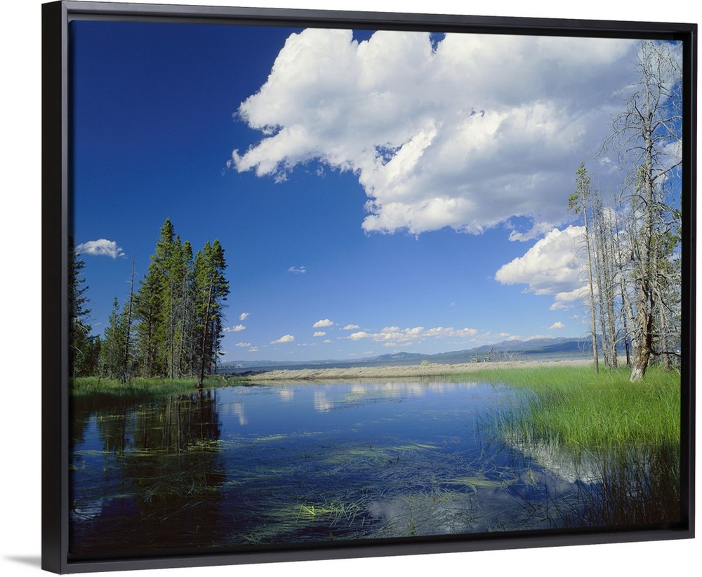 <p>Large photo on canvas of a lake with clouds and a forest reflected in it.</p>