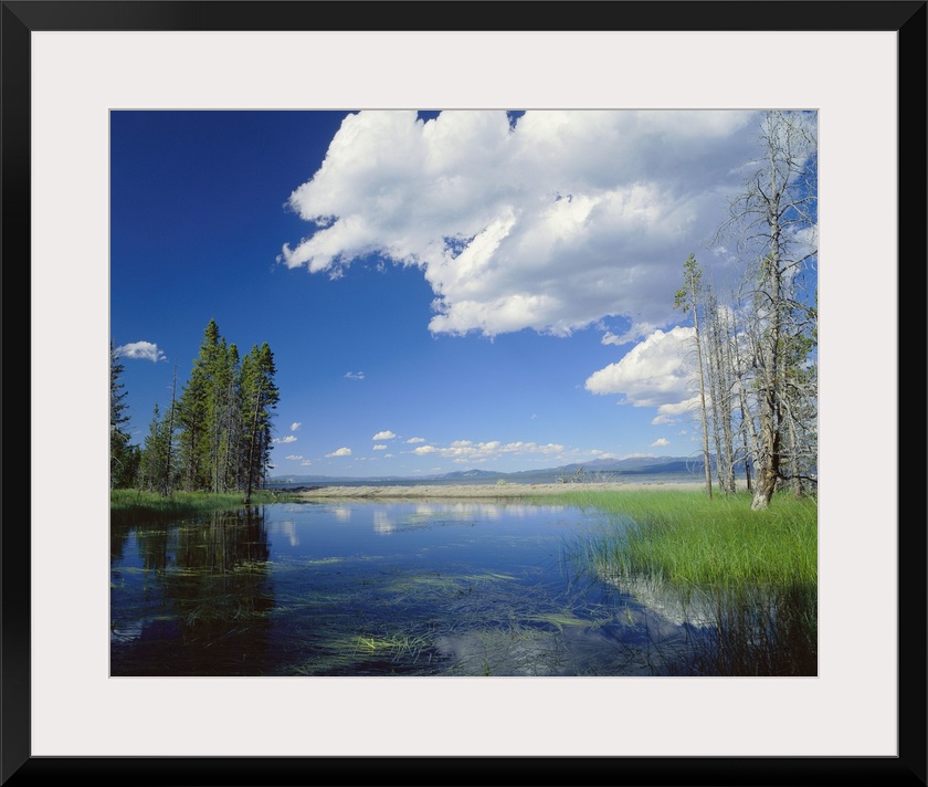 <p>Large photo on canvas of a lake with clouds and a forest reflected in it.</p>