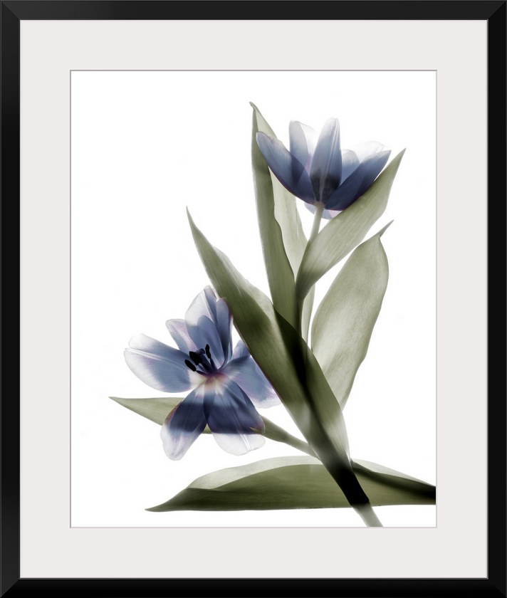 <p>X-ray photograph of a pink and purple tulip on a white background.</p>