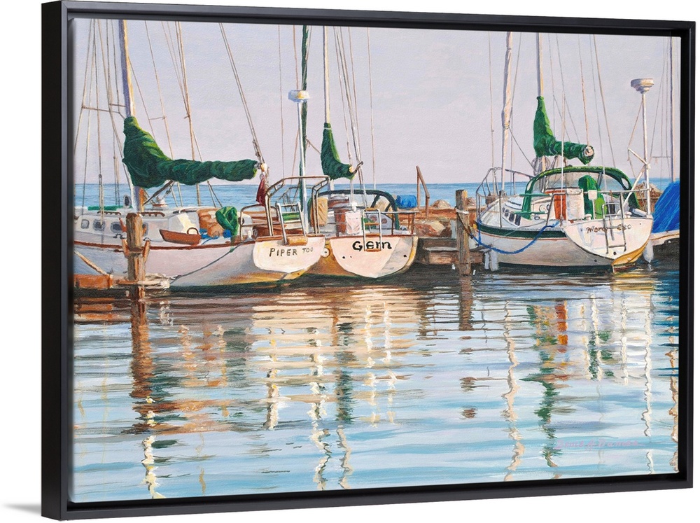 <p>Contemporary painting of a group of yachts docked in the ocean.</p>
