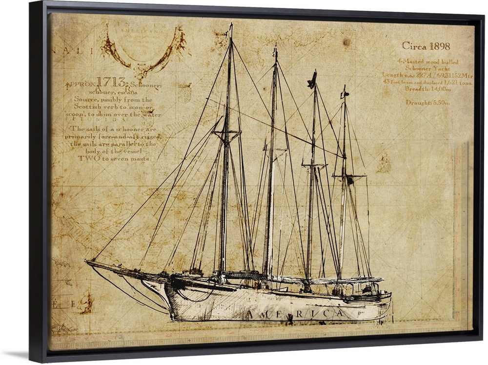 <p>Contemporary artwork of a vintage looking drawing of a yacht.</p>