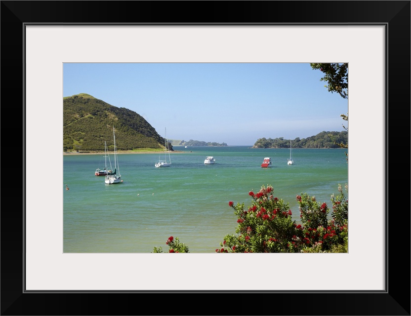 <p>Pohutukawa tree and yachts moored in Waipiro Bay, Parekura Bay, Bay of Islands, Northland, North Island, New Zealand</p>