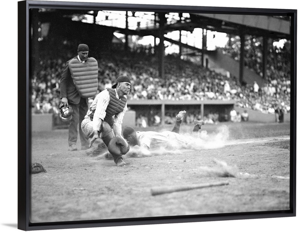 <p>Yankees Lou Gehrig scores as Joe Harris' throw gets away from catcher Hank Severeid of Senators. New York Yankees beat Washington, Senators 3-2. Aug. 16, 1925.</p>