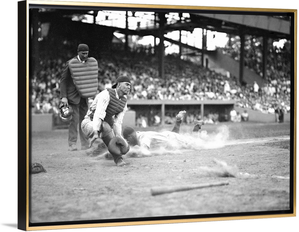 <p>Yankees Lou Gehrig scores as Joe Harris' throw gets away from catcher Hank Severeid of Senators. New York Yankees beat Washington, Senators 3-2. Aug. 16, 1925.</p>