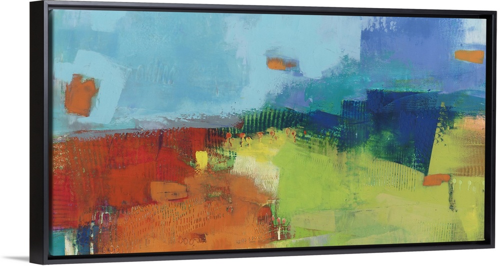 <p>Abstract modern art print in cheerful shades of blue, orange, and green.</p>