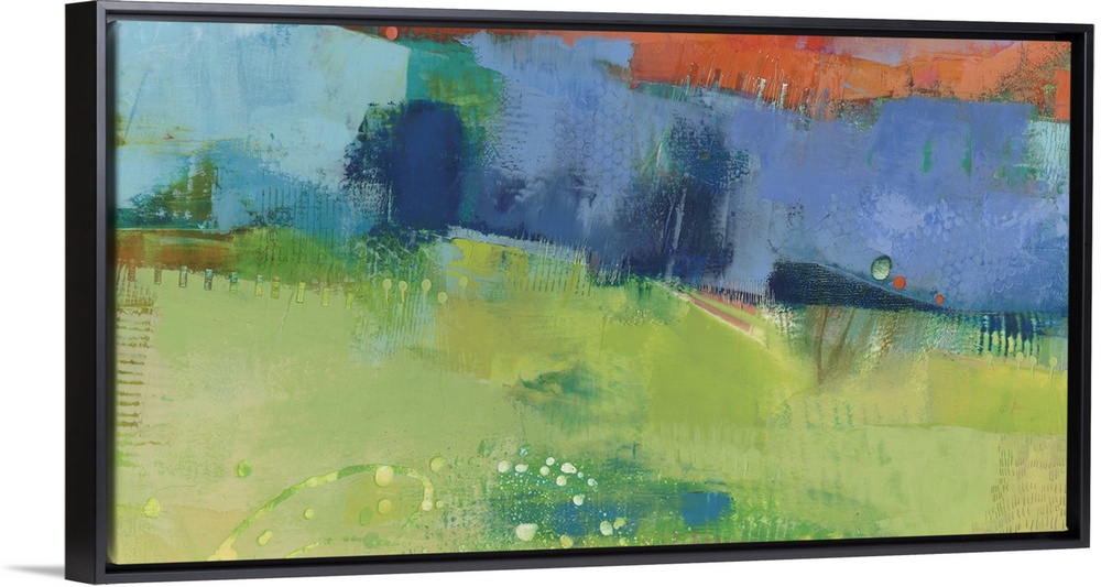 <p>Abstract modern art print in cheerful shades of blue, orange, and green.</p>