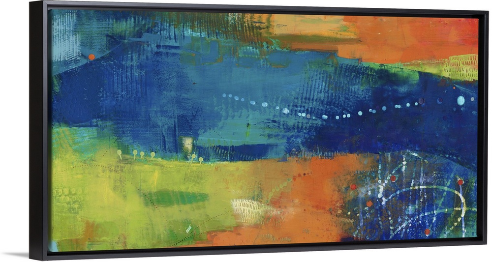 <p>Abstract modern art print in cheerful shades of blue, orange, and green.</p>