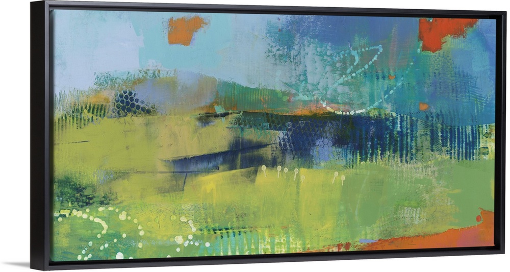 <p>Abstract modern art print in cheerful shades of blue, orange, and green.</p>