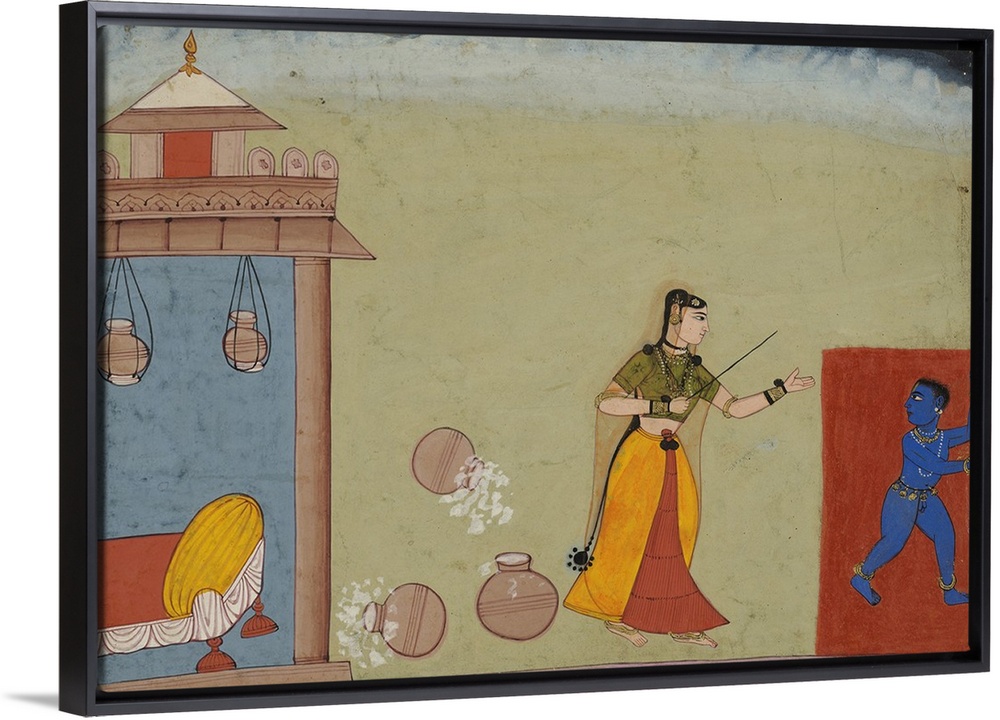 <p>Yashoda Chastises Her Foster Son, the Youthful Krishna, page from a manuscript of the Bhagavata Purana, c.1600, opaque watercolour on paper heightened with gold.</p>