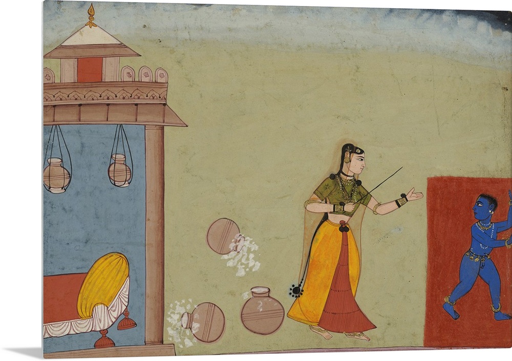 <p>Yashoda Chastises Her Foster Son, the Youthful Krishna, page from a manuscript of the Bhagavata Purana, c.1600, opaque watercolour on paper heightened with gold.</p>
