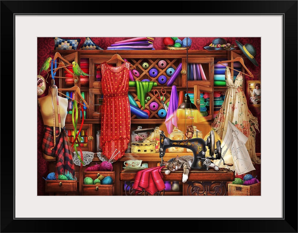 <p>Illustration of a sewing room with fabric and yarn all over and a cat napping on the vintage sewing machine.</p>
