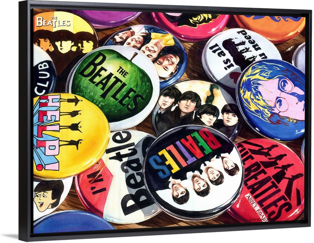 <p>Watercolor painting of a collection of Beatles pins/buttons/badges on a wooden table.</p>