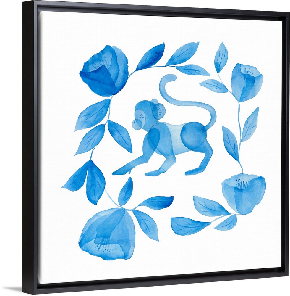 Art Blue Wall Art Decorative Art Florals Painting Watercolor Wildlife Monkey and Ape