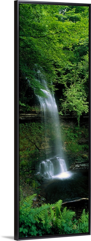 <p>Vertical panoramic photograph of water cascading over a tree covered cliff's edge down to a lagoon.</p>