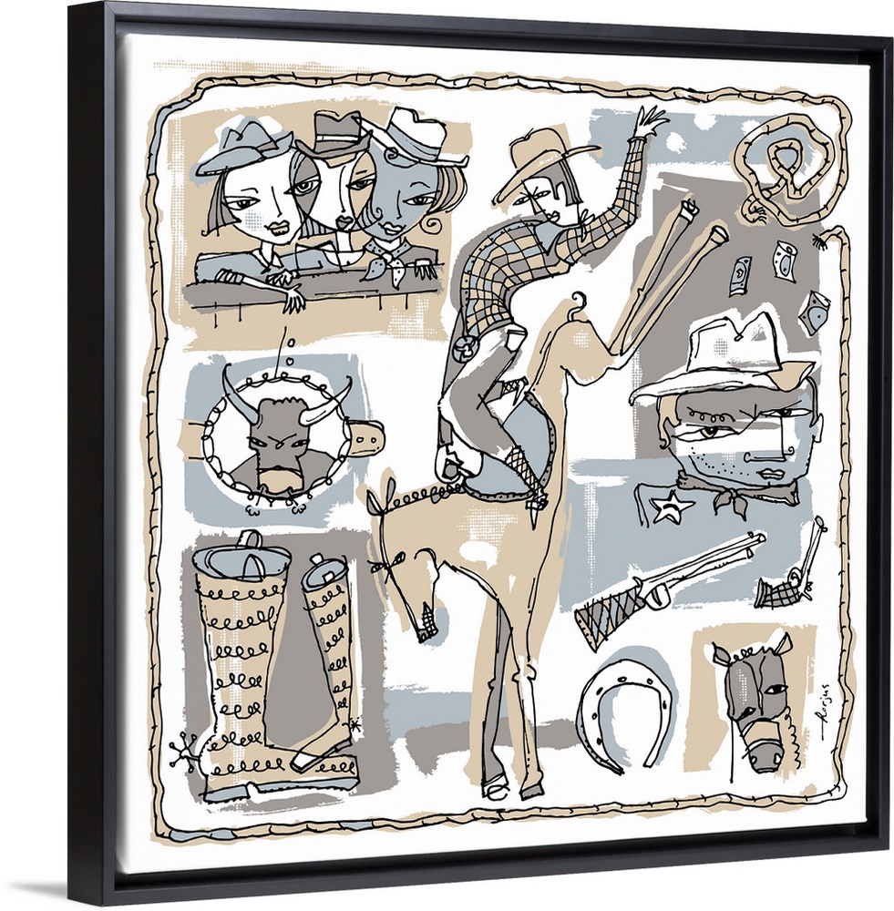 <p>Rodeo scene of cowboy riding wild horse with cowgirls looking on and guns and bulls in the background.</p>
