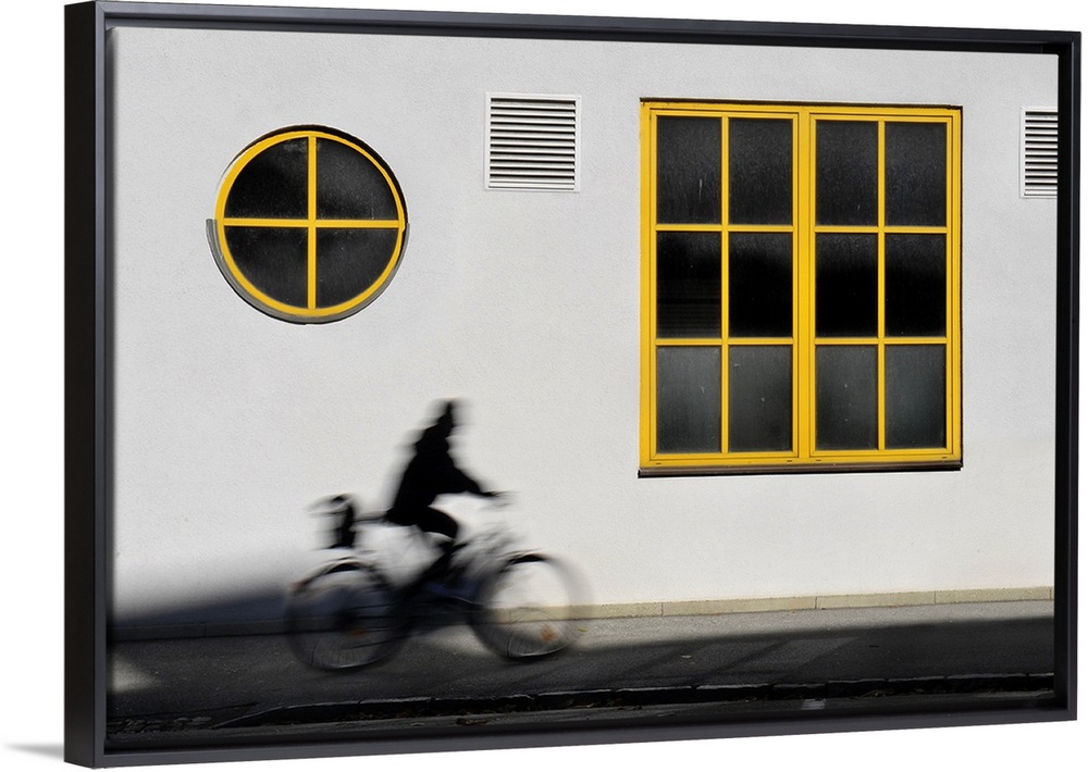 <p>A person rides by a white wall with yellow trim windows on bicycle.</p>