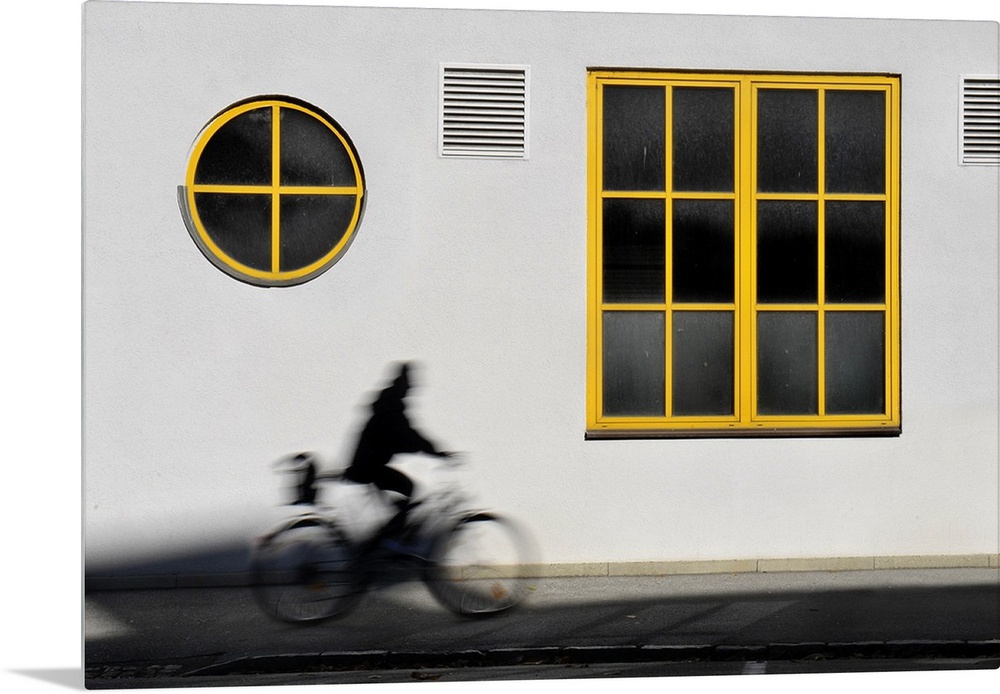 <p>A person rides by a white wall with yellow trim windows on bicycle.</p>
