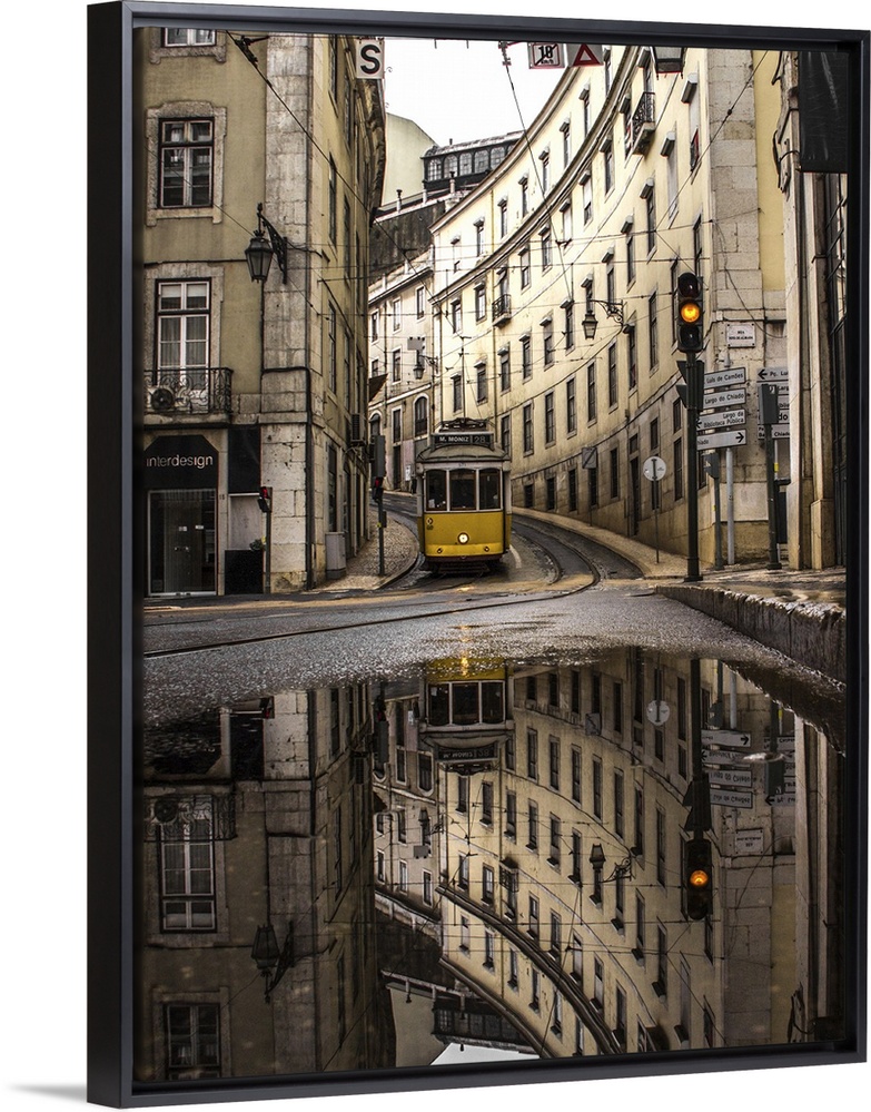 <p>An old street of Lisbon with a yellow train coming. Yellow traffic light. The street view reflects in a puddle.</p>