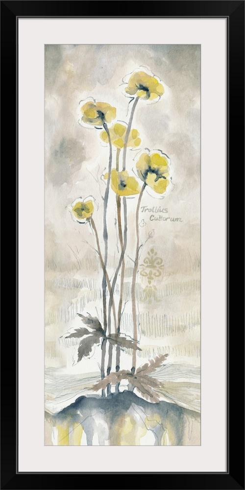 <p>Tall watercolor painting of long stemmed yellow flowers on a neutral colored background.</p>