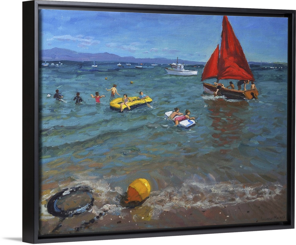 <p>Contemporary painting of a sailboat in the water with people wading nearby.</p>