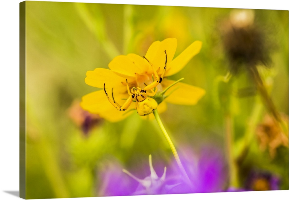 <p>Yellow Crab Spider (Thomisus callidus) on a yellow flower in Cave Creek Canyon in the Chiricahua Mountains near Portal; Arizona, United States of America.</p>