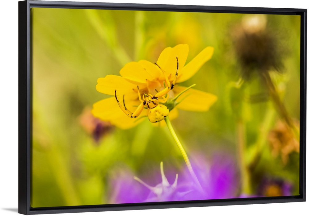 <p>Yellow Crab Spider (Thomisus callidus) on a yellow flower in Cave Creek Canyon in the Chiricahua Mountains near Portal; Arizona, United States of America.</p>