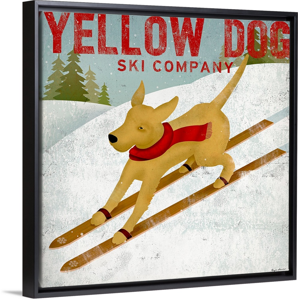 <p>Square painting of a dog skiing down a snowy mountain with text at the top.</p>