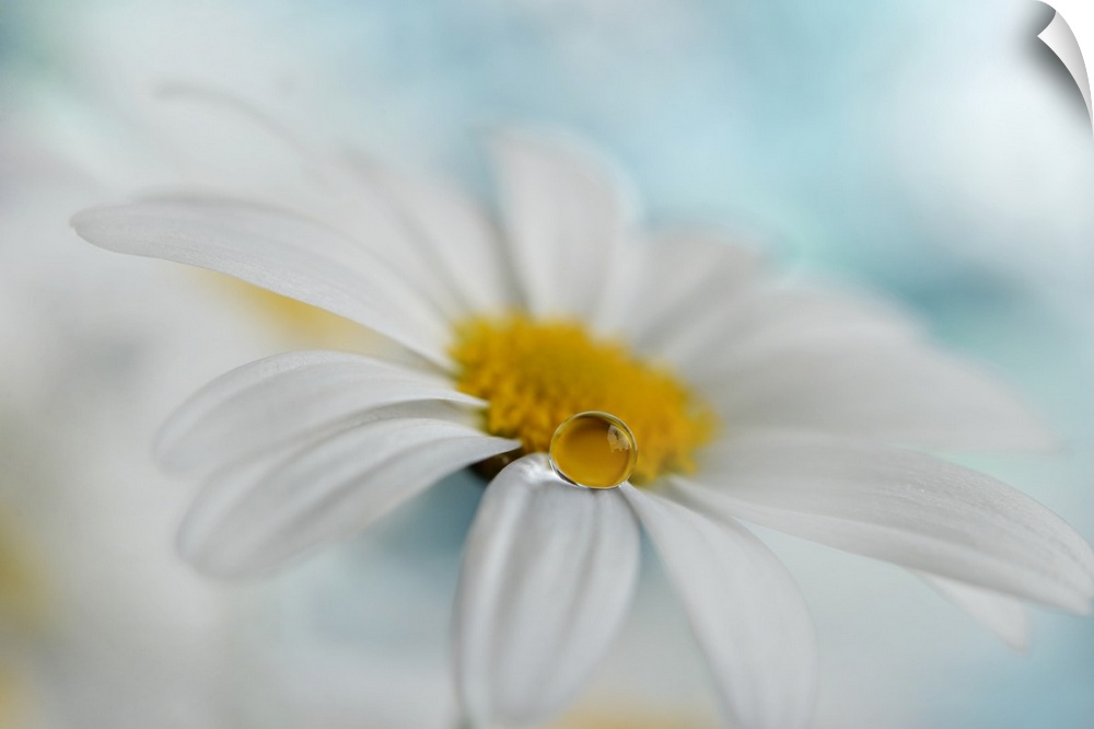 <p>A large droplet of water balancing on the edge of a white daisy petal.</p>