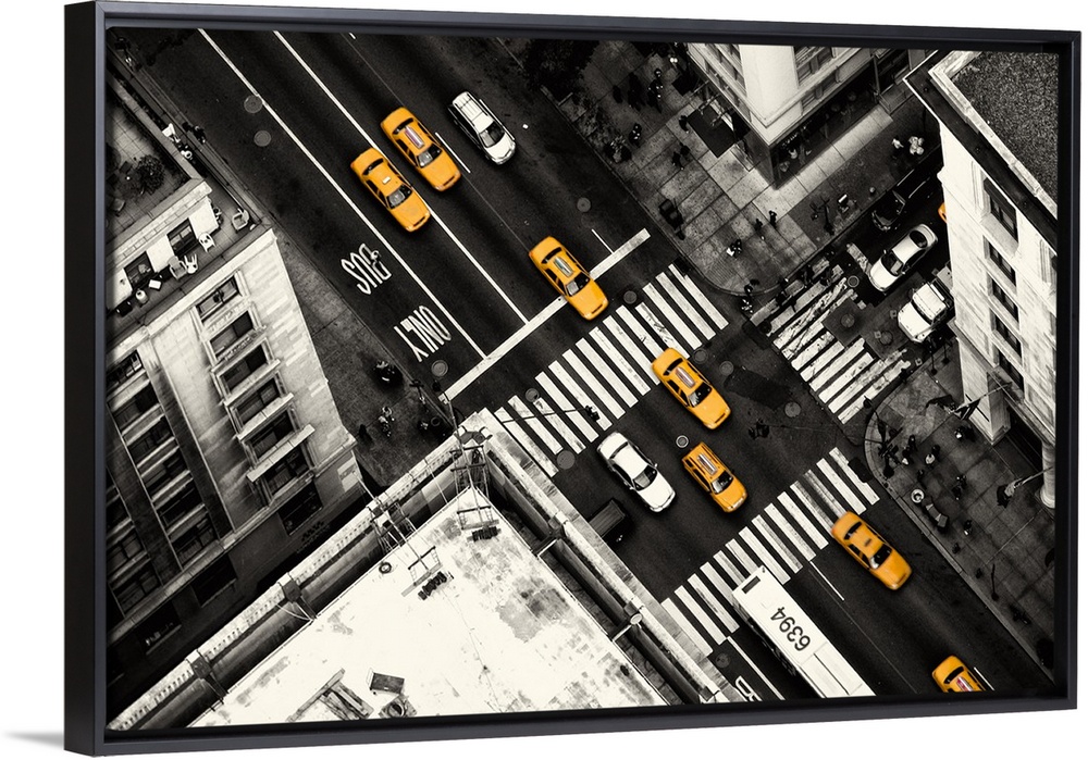<p>Aerial view of a Manhattan street with yellow taxi cabs standing out against the dark grey road.</p>
