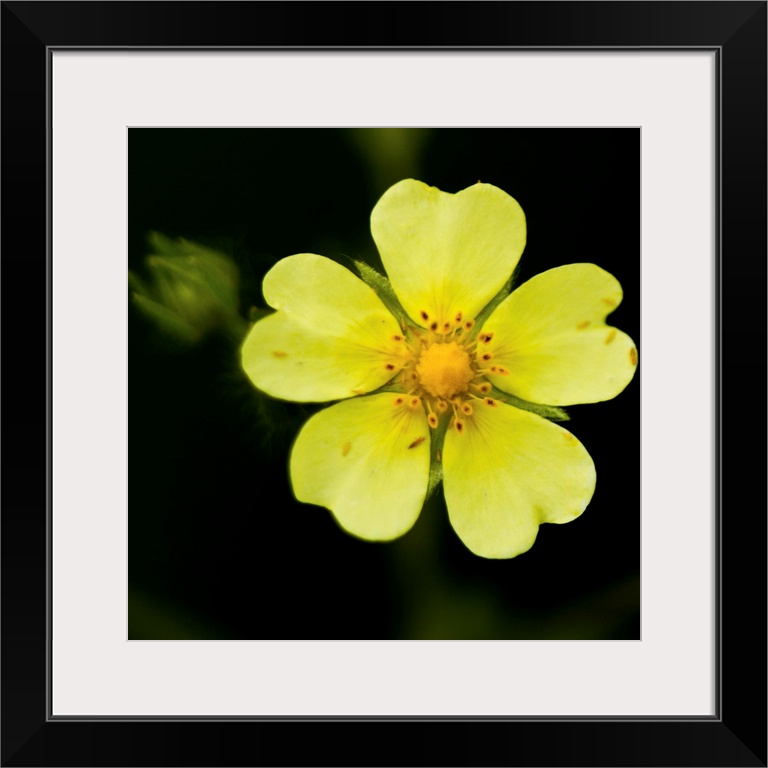 <p>Yellow flower with five heart shaped petals, with green bud on one side against dark background, US.</p>