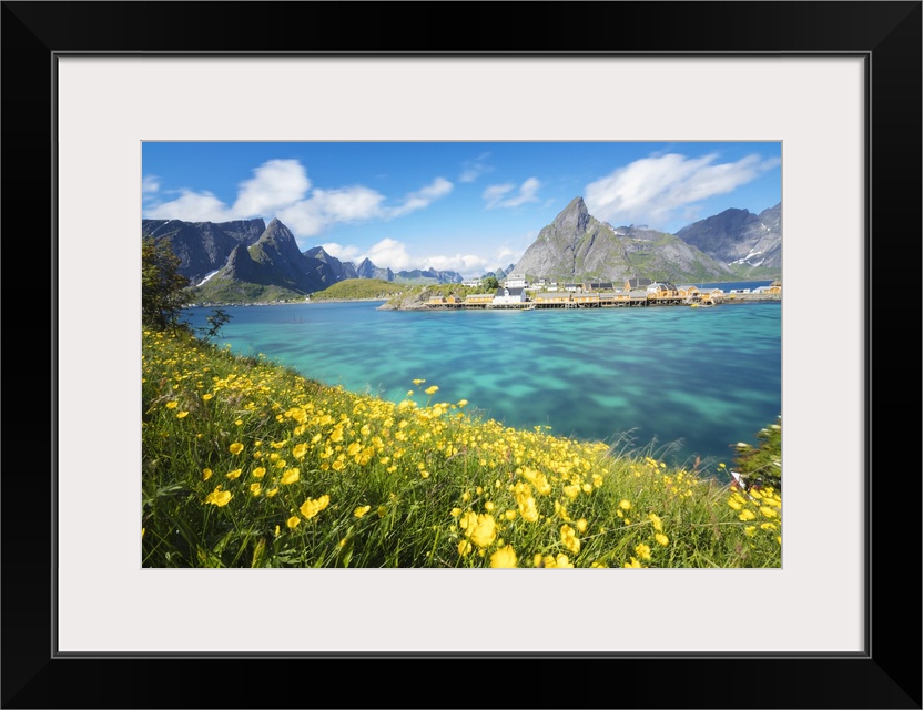 <p>Yellow flowers in bloom beside the turquoise sea and the fishing village of Sakrisoy, Reine, Moskenesoya, Lofoten Islands, Norway, Scandinavia, Europe</p>
