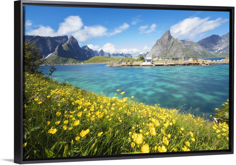 <p>Yellow flowers in bloom beside the turquoise sea and the fishing village of Sakrisoy, Reine, Moskenesoya, Lofoten Islands, Norway, Scandinavia, Europe</p>