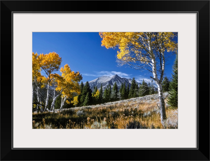 <p>Vibrant yellow foliage on aspen trees and Electric Peak in the background, Gallatin Range in Yellowstone National Park, Montana, United States of America</p>