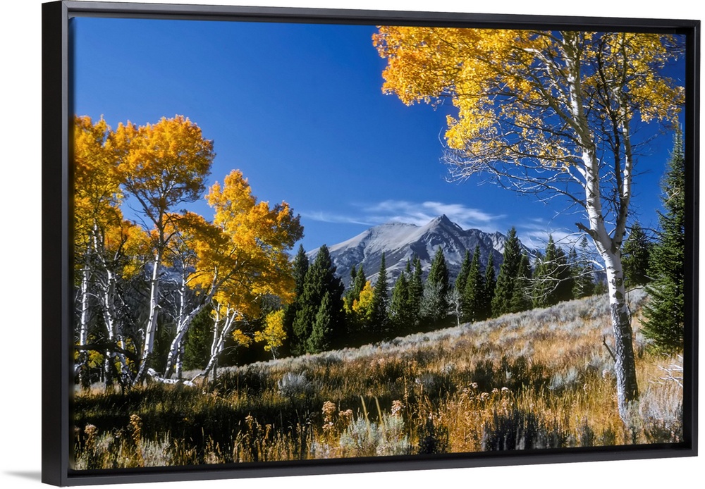 <p>Vibrant yellow foliage on aspen trees and Electric Peak in the background, Gallatin Range in Yellowstone National Park, Montana, United States of America</p>