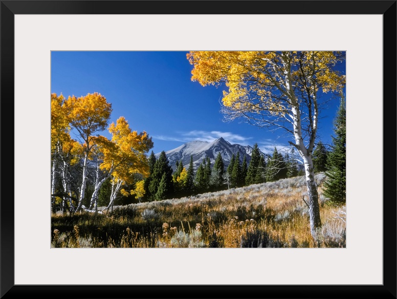 <p>Vibrant yellow foliage on aspen trees and Electric Peak in the background, Gallatin Range in Yellowstone National Park, Montana, United States of America</p>