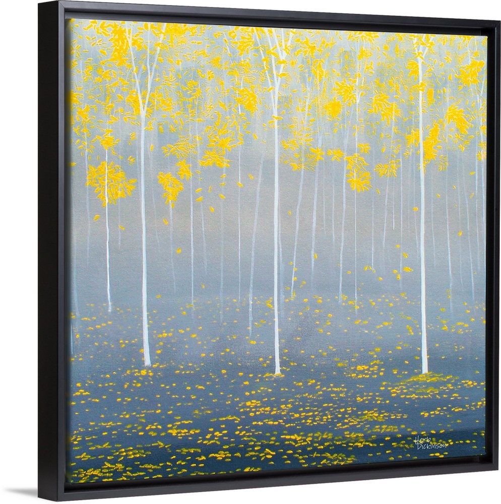 <p>Yellow Autumn trees in a gray-blue forest on a square background.</p>