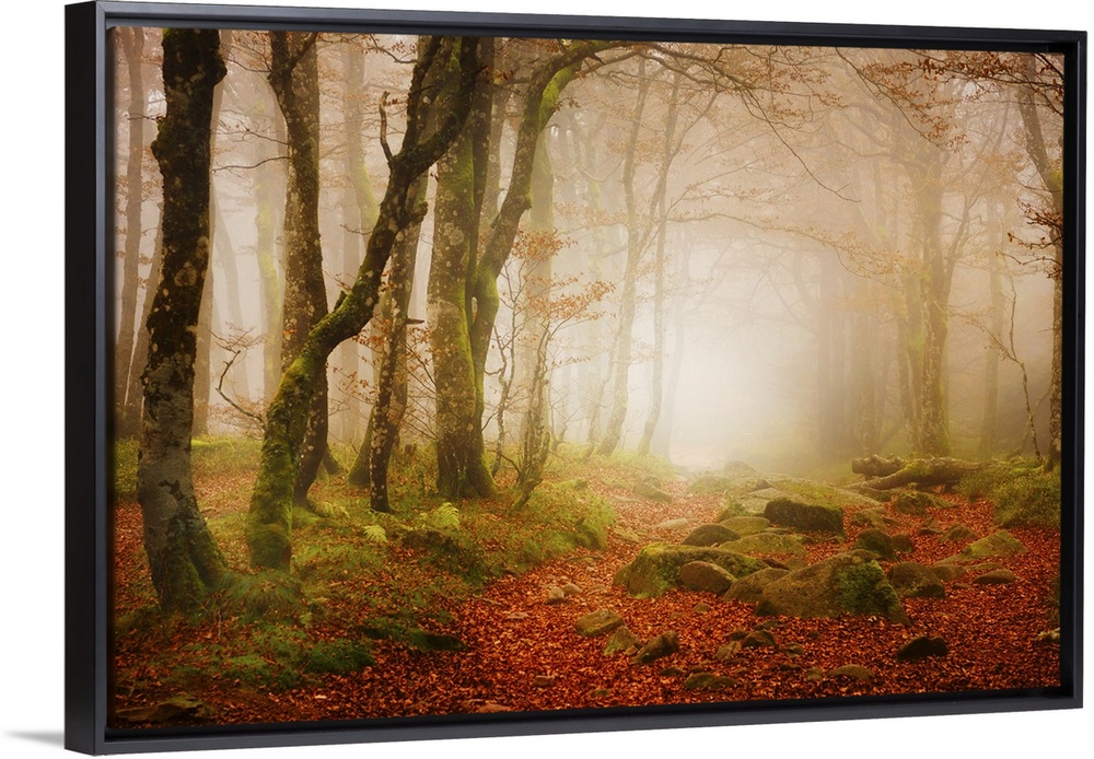 <p>A foggy forest covered in red fallen leaves and mossy green rocks.</p>