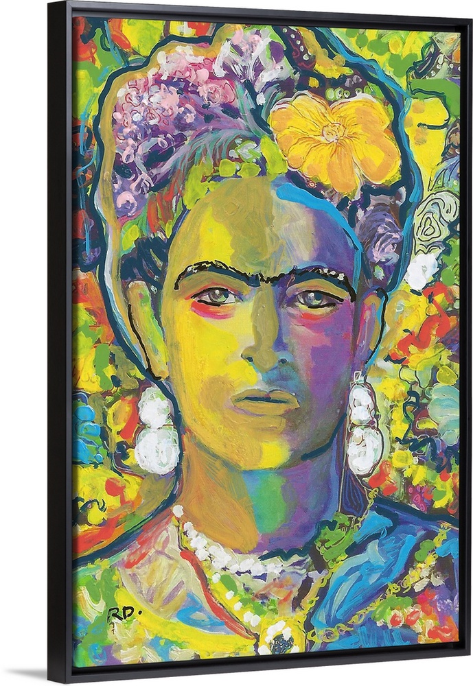 <p>Yellow Frida by RD Riccoboni, painted in gold and yellow tones with red blue green purple and orange</p>