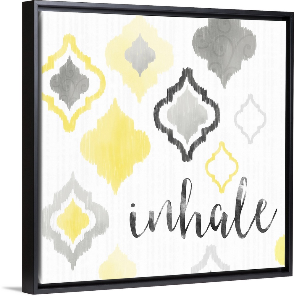 <p>A square decorative artwork of Moroccan tile designs in yellow and gray with the text 'inhale'.</p>