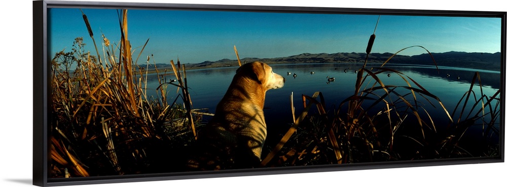 <p>Panoramic photograph displays a dog patiently waiting in a group of cattails overlooking a large lake filled with decoys in Montana. In the distance, the mountains can be seen reflecting over the water of the lake.</p>